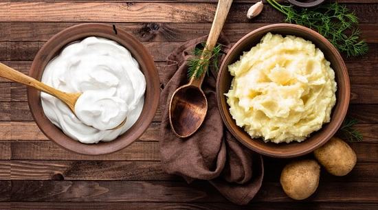 - Trộn khoai tây đã được nghiền nhỏ với sữa tươi hoặc sữa chua không đường thành hỗn hợp sáng mịn.